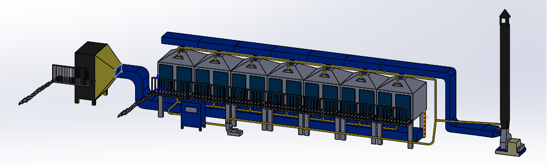 ①車橋車間:廢氣收集+干式過濾箱+活性炭吸附/催化燃燒脫附設備+引風機,風量設計140000 m3/h。